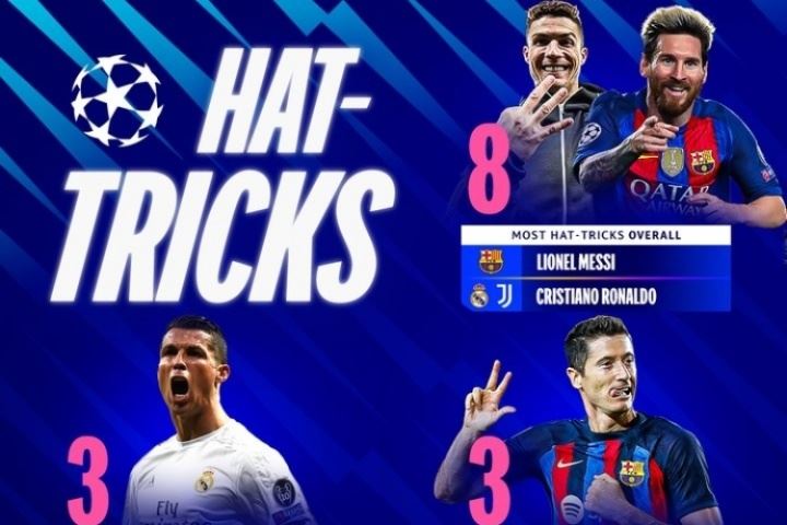 欧冠戴帽各项纪录:梅罗8次并列最多、莱万、萨拉赫、鲁尼上榜